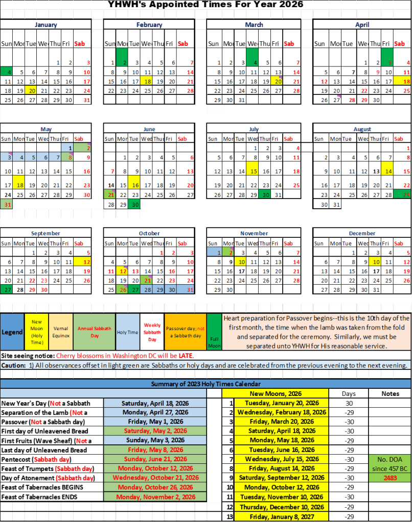 For the year 2026, the annual feasts are delayed by a month, similar to those in the year 1844. From our published calendar, you will notice that it is exactly one month delayed from the current “Jewish” calendars. We are fully aware of this disparity as were the Adventists of the Seventh-month Movement in 1844. As a general rule, though, we do not observe God’s appointed times based simply on the Karaite or Rabbinic calendars, but on the Creation Calendar markers, which dictates that the first month begins with the New Moon that occurs “on or after” the Vernal Equinox (VE). In 2026, the earth crosses the VE on March 20th at 10:46 AM, EST. However, to begin that day, the sun sets at 7:22 PM, EST, March19th (beginning of the 20th, Biblical time), making the sighted moon fully 13 hrs-24 minutes later (nearly a full day after) than the Equinoxal time. This later occurrence of VE demands an intercalation by one month, called Adar-2, hence the true beginning of the Biblical year in 2026, will occur on the new moon of April 17th, sunset (7:56 PM, EST, the 18th by Biblical time). From this new moon, all other festivals for the year are punctuated.